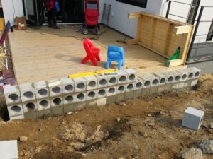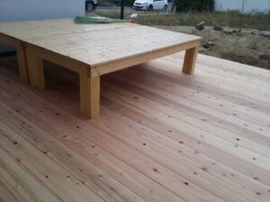 우리 집 데크입니다. 깐 지 얼마 안 되어 향기가 장난 아니네요.(당시) 데크 앞쪽 담장 쌓기