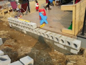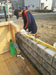 땅을 다져서 기초 만들기, 땅을 다지고 파쇄석을 깔았어요. 그리고 와이어 메시를 넣고 레미탈을 부었습니다. 그리고 하루가 지나서 벽돌을 쌓기 시작했습니다.