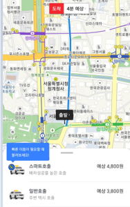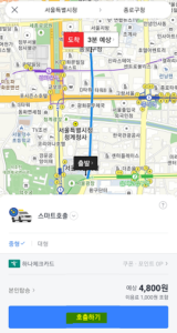 출발지, 도착지 모두 설정이 완료되면, 현재 주위에 가능한 택시들이 나오게 됩니다. 스마트 호출 또는 일반호출 중에 선택하여 눌러주시고 호출하기 버튼을 누르시면 호출이 시작됩니다.