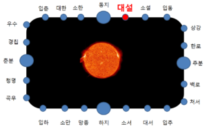 24절기는 아래와 같이 24개의 절기가 있습니다. 12월 7일이 대설이 되는 거지요. 24절기의 경우 농경사회에서 많이 사용하던 절기인데요. 이 24절기를 농하여 농사를 시작하거나 , 추수를 하거나하는 기준으로 많이 삼았습니다. 대설의 경우는 농한기로 새해를 맞이하고 농사일을 마무리하는 시기입니다.