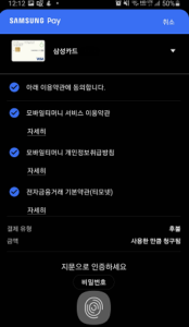 카드를 선택하게 되면 아래와 같이 페이지가 오픈됩니다. 그러면 모든 이용약관에 동의를 하고 지문 또는 비밀번호로 승인을 합니다.