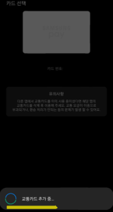 지문 또는 비밀번호를 이용하여 인증하게 되면 아래와 같이 교통카드 추가 중으로 화면이 넘어갑니다. 이제 다되었군요.