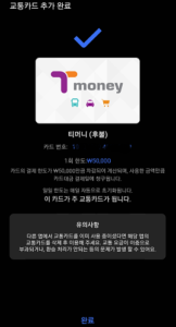 이제 교통카드 추가 완료되었습니다. 축하드립니다. 휴대폰을 바꾸지 않거나, 카드가 바뀌지 않는 한 변경하실 필요가 없습니다.