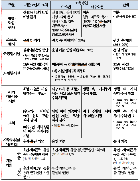 거리두기 조정 방안 비교표는 아래와 같습니다. 참조하세요.