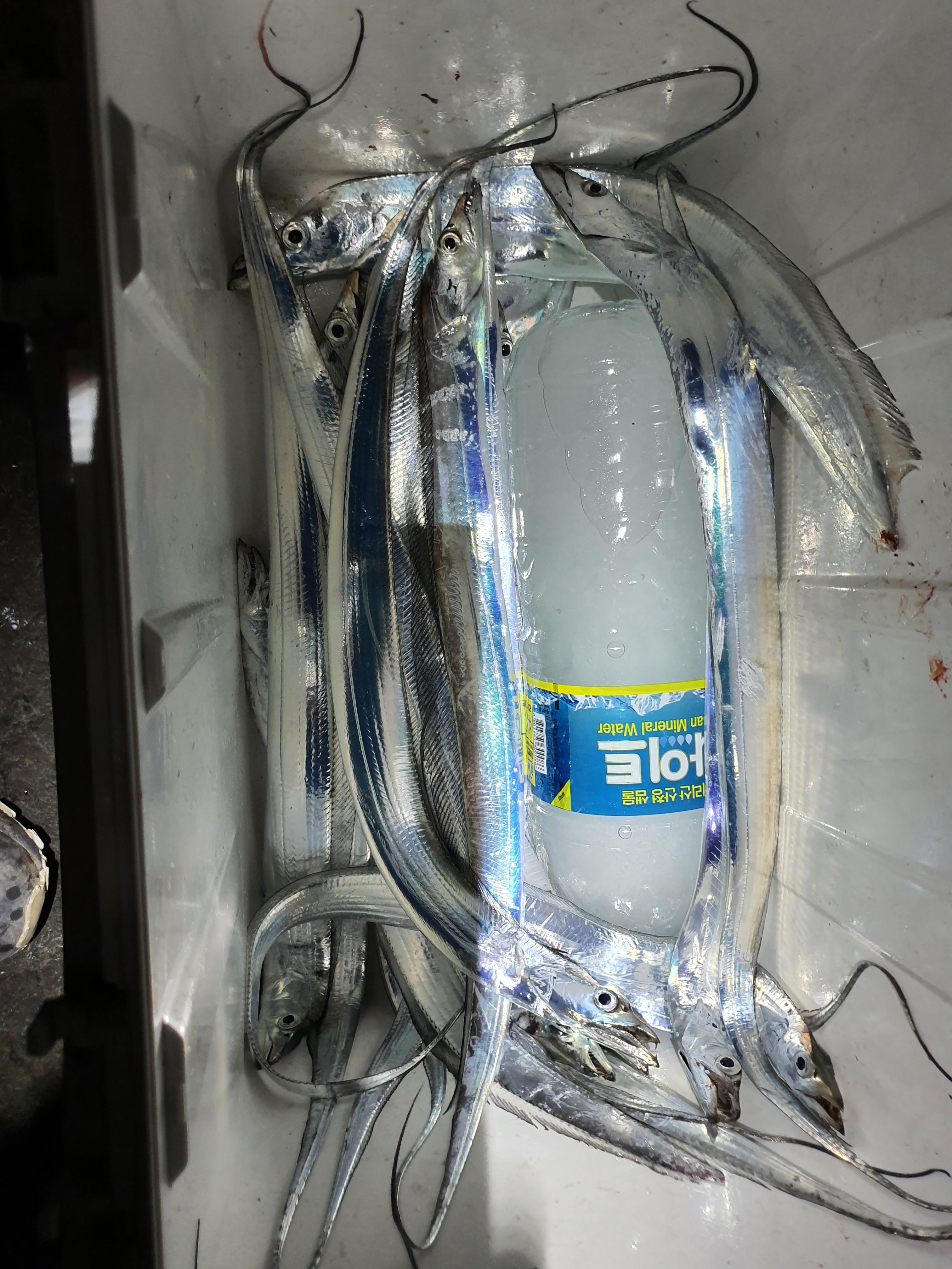 낚시를 시작하여 몇 마리 잡았는데요. 꼬리가 없는 놈이 보이죠.. 갈치는 자기네 들의 꼬리까지 잘라먹습니다. 먹성이 아주 좋습니다. 생미끼로 전갱이를 사용하여도 되어요. 갈치 꼬리를 잘라서 미끼로 사용해도 갈치를 잡을 수 있습니다.