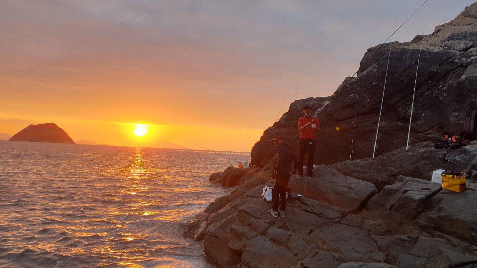포인트에 도착 후 낚싯대와 라이트(캐미)와 루어(풀치 왕) 채비를 준비하고 어두워질 때까지 기다리고 있습니다. 어두워 지면 바로 두척 해야죠..