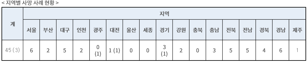 10.24일 13:00 기준으로 독감 백신 사망(예방접종 후) 사례는 45건으로 집계되었다고 합니다. 아래 테이블 참조하세요.