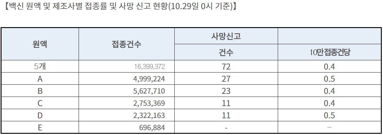 7개 제조회사의 42개 제조번호로 원액, 제조회사별로 접종 건수 대비 사망신고건을 비교했을 때 사망 사례가 접종한 백신이 특정 원액, 특정 제조사에 편중되지 않았다고 밝혔습니다.