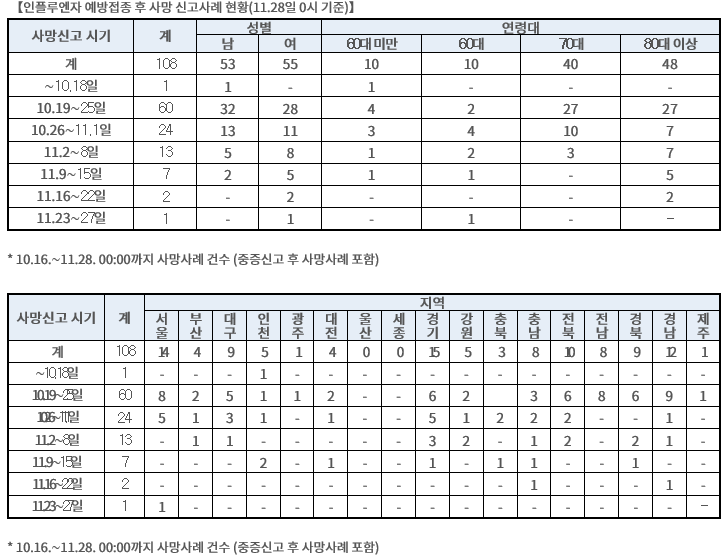 11월 28일 기준 현재 독감백신 사망자수 108명