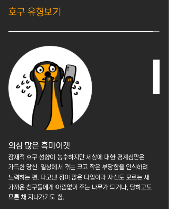 안녕하세요. Hoo^2입니다. 호구성향 테스트를 한번 해보도록 하겠습니다. 내가 정말 호구 인지 확인할 수 있는 기회가 되겠네요.. 신중하게 답을 작성해야 하겠어요..