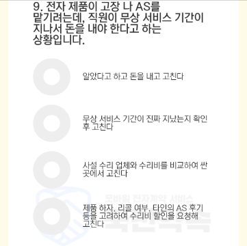 -전자 제품이 고장 나 AS를 맡기려는데, 직원이 무상 서비스 기간이 지나서 돈을 내야 한다고 하는 상황입니다.