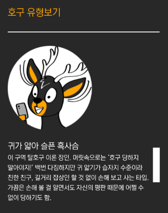 팔랑귀를 가진 귀가 얇아 슬픈 흑 사슴이 등장하고요, 차가운 도시의 흑염소도 나옵니다. 오지랖이 넓어 바다 같습니다.