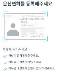 다음은 운전면허증 등록입니다. 운전면허증 촬영 버튼을 눌러 편하게 등록할 수 있으니, 걱정 안 하셔도 됩니다.