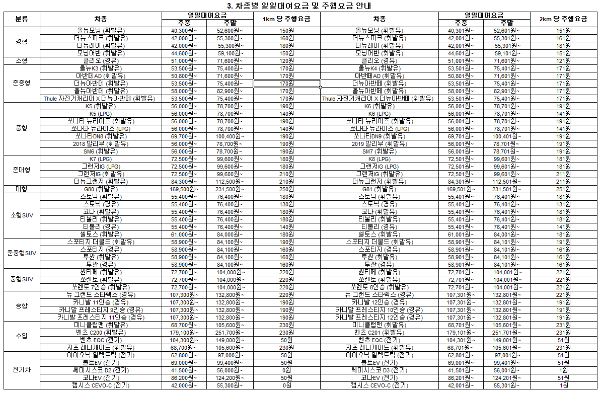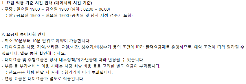 -반납 시에 결재가 이뤄지고 주행거리에 따라 Km당 주행요금이 부과됩니다.