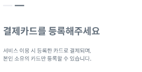 다음으로는 결제카드 등록을 진행하게 됩니다. 이용 시 이 카드로 비용이 빠져나가게 되고 등록 카드는 본인 카드만 등록할 수 있습니다.