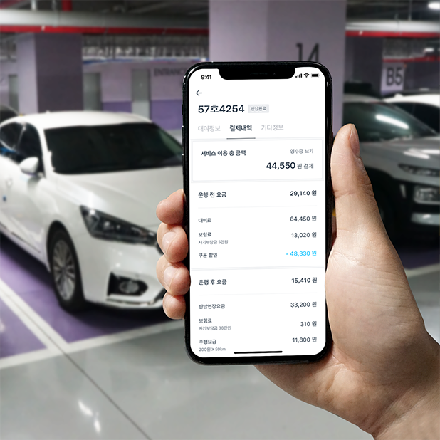 반납 후 결제내역을 확인하고, 이용한 만큼 km당 주행요금이 결제되며, 이용시간을 연장하거나 하이패스를 이용한 경우 함께 결제가 됩니다.