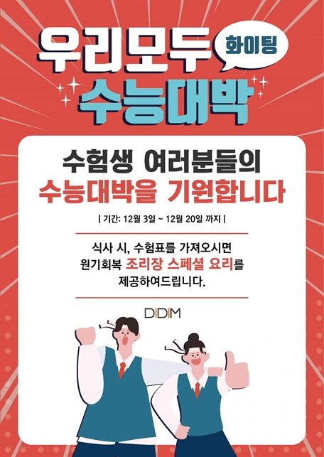 디딤은 12월 3일부터 12월 20일까지 식사 시에 수험표를 가져오면 원기회 조리장 스페셜 요리를 제공해 준다고 하니 맛있는 조리장 스페셜 요리를 만끽하세요.