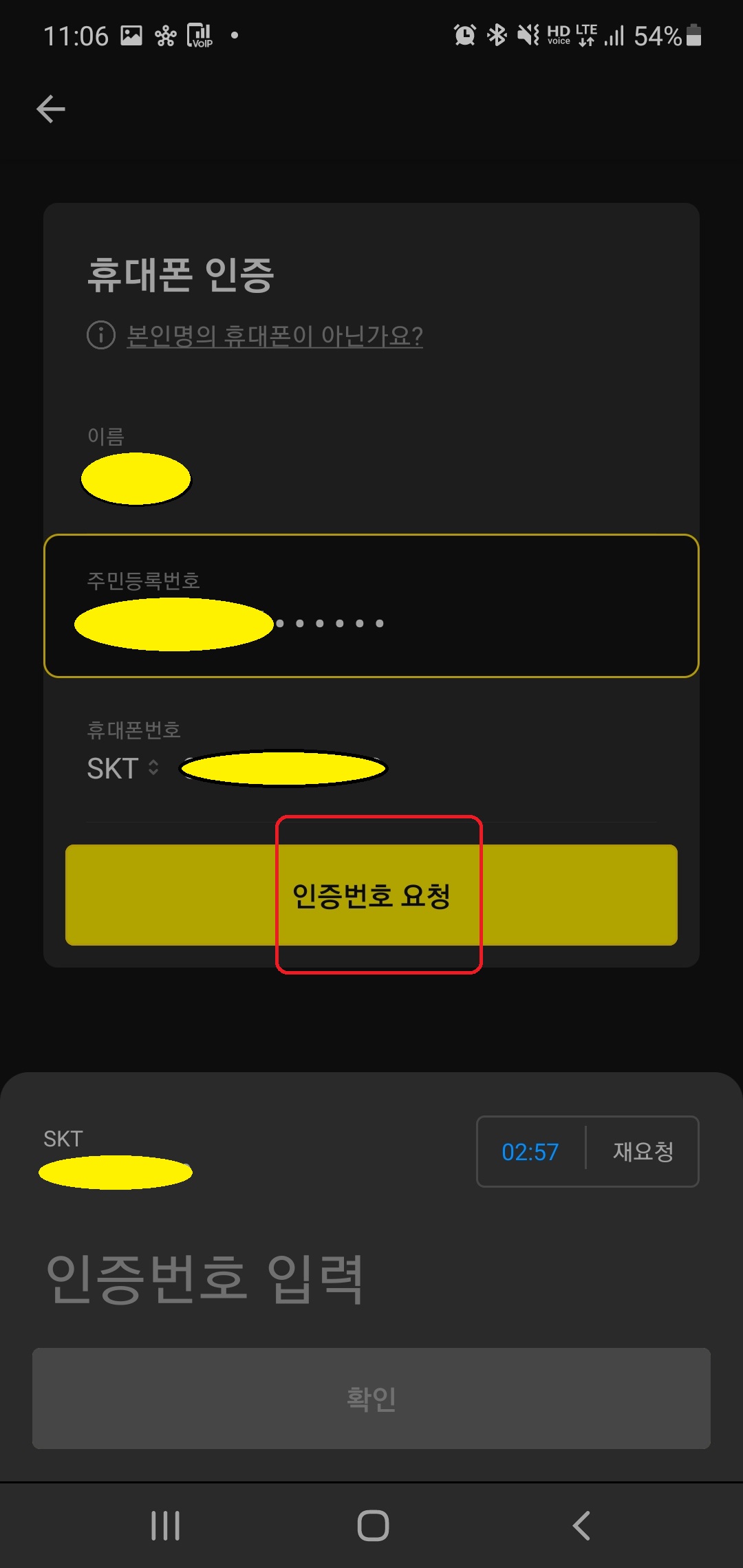 인증번호 요청 버튼을 누르게 되면 인증번호가 오게 되는데 자동으로 입력이 됩니다. 여기까지 잘 따라오고 계십니다.