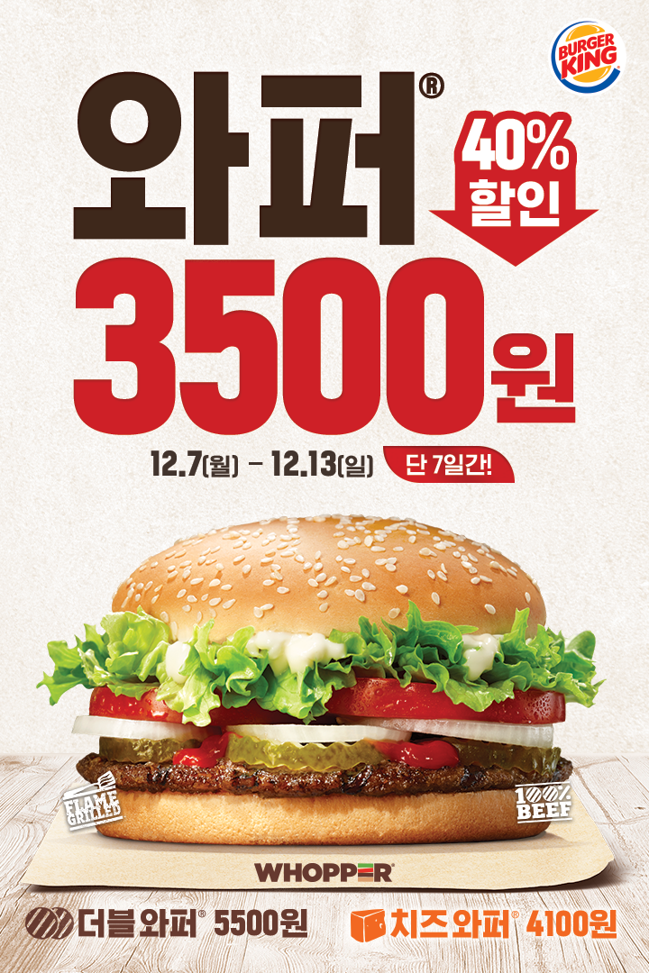 더블 와퍼는 5500원이며, 치즈 와퍼는 4100원으로 40% 할인이 들어갑니다.