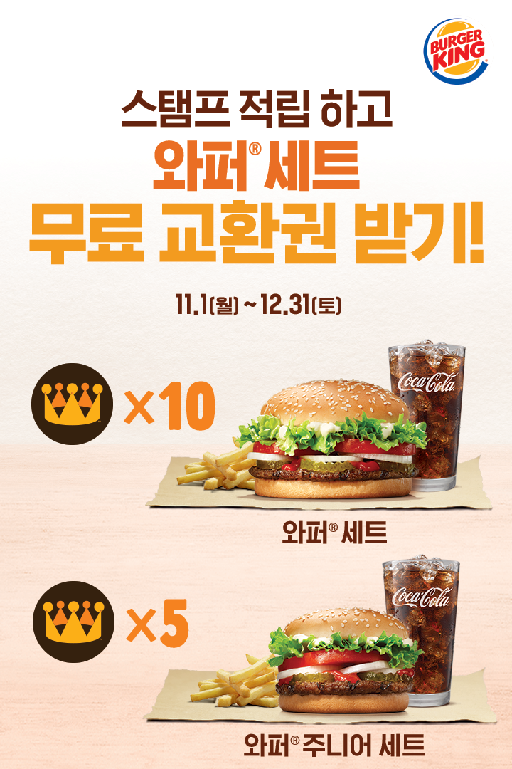 *스탬프 5개 적립 시 와퍼주니어 세트, 스탬프 10개 적립 시 와퍼 세트 무료 교환권을 받을 수 있습니다.