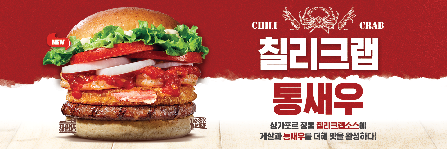 싱가포르 정통 칠리크랩 소스에 게살과 통새우를 더해 맛을 완성한 칠리크랩 통새우 버거 한번 즐겨 보세요.