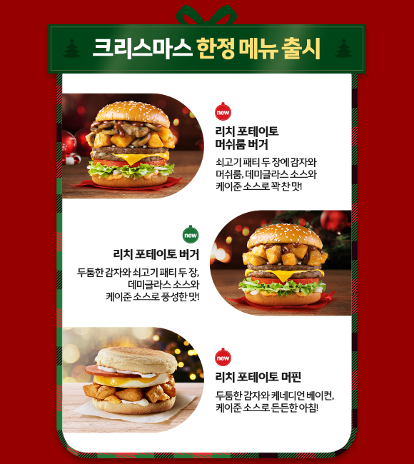 크리스마스 한정 메뉴 출시는 리치 포테이토 머쉬룸 버거와 기치 포테이토 버거, 리치 포테이토 머핀이 있습니다. 사러 갑시다.