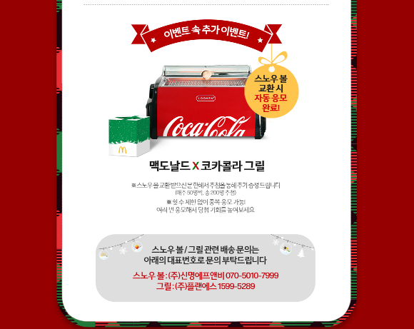 맥도날드가 준비한 특별한 크리스마스 선물은 맥도날드 스노우 볼과 스노우 볼 교환 시에 자동으로 응모가 되어 이벤트 속 추가 이벤트가 됩니다. 이 이벤트의 선물은 맥도날드 x 코카콜라 그릴을 추첨을 통해 받을 수 있습니다.