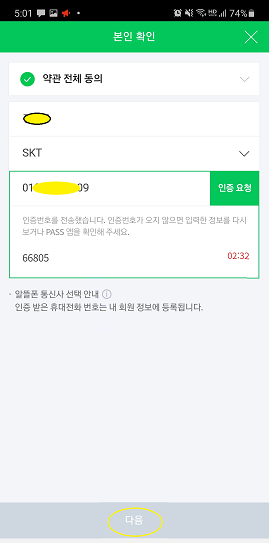 다음은, 본인 확인 작업이 시작됩니다. 여기서 이름을 입력하시고요, 통신사 선택하시고 전화번호 입력하여서 본인 확인 작업을 진행하시면 됩니다. 인증 요청을 하시면 인증번호가 메시지로 송부가 되는데요. 인증 번호는 6자리입니다. 입력하시면 됩니다. 그리고,