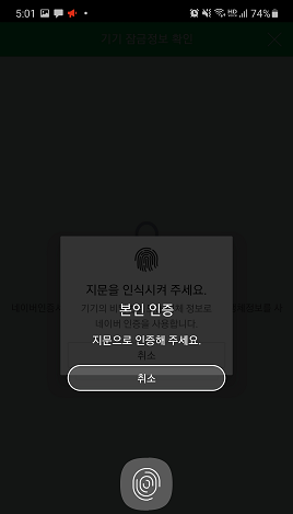 다음은 기기 잠금 정보 확인 이 있습니다. 지문이나 홍채 등으로 인증을 완료하시면 다음 페이지로 넘어가게 되는데요. 이제 마지막 단계입니다.