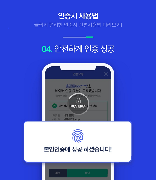 지문으로 인증을 완료하면 본인인증에 성공하셨다고 메시지가 뜨면서 간단하게 인증을 진행할 수 있습니다.