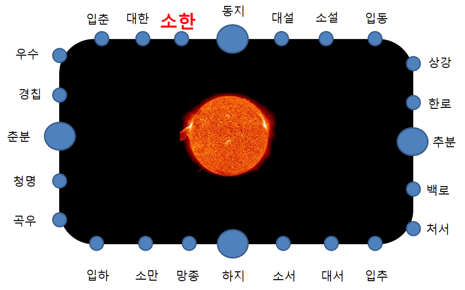 24절기는 태양을 기준으로 춘분을 시작으로 각절기마다 15도씩 360도를 24개의 절기로 나눈 것입니다. 24절기 중 23번째인 소한에 대해 간단하게 정리해보도록 하겠습니다.