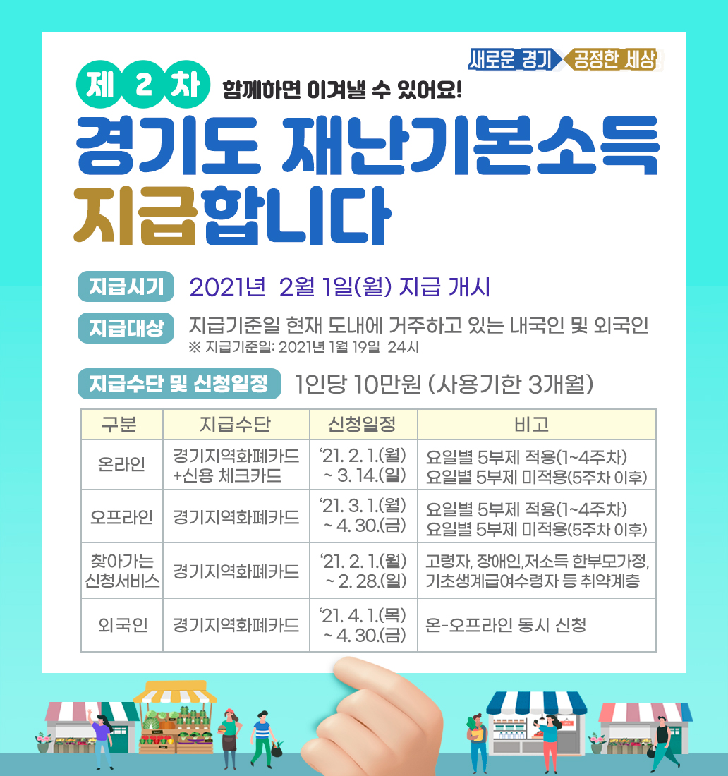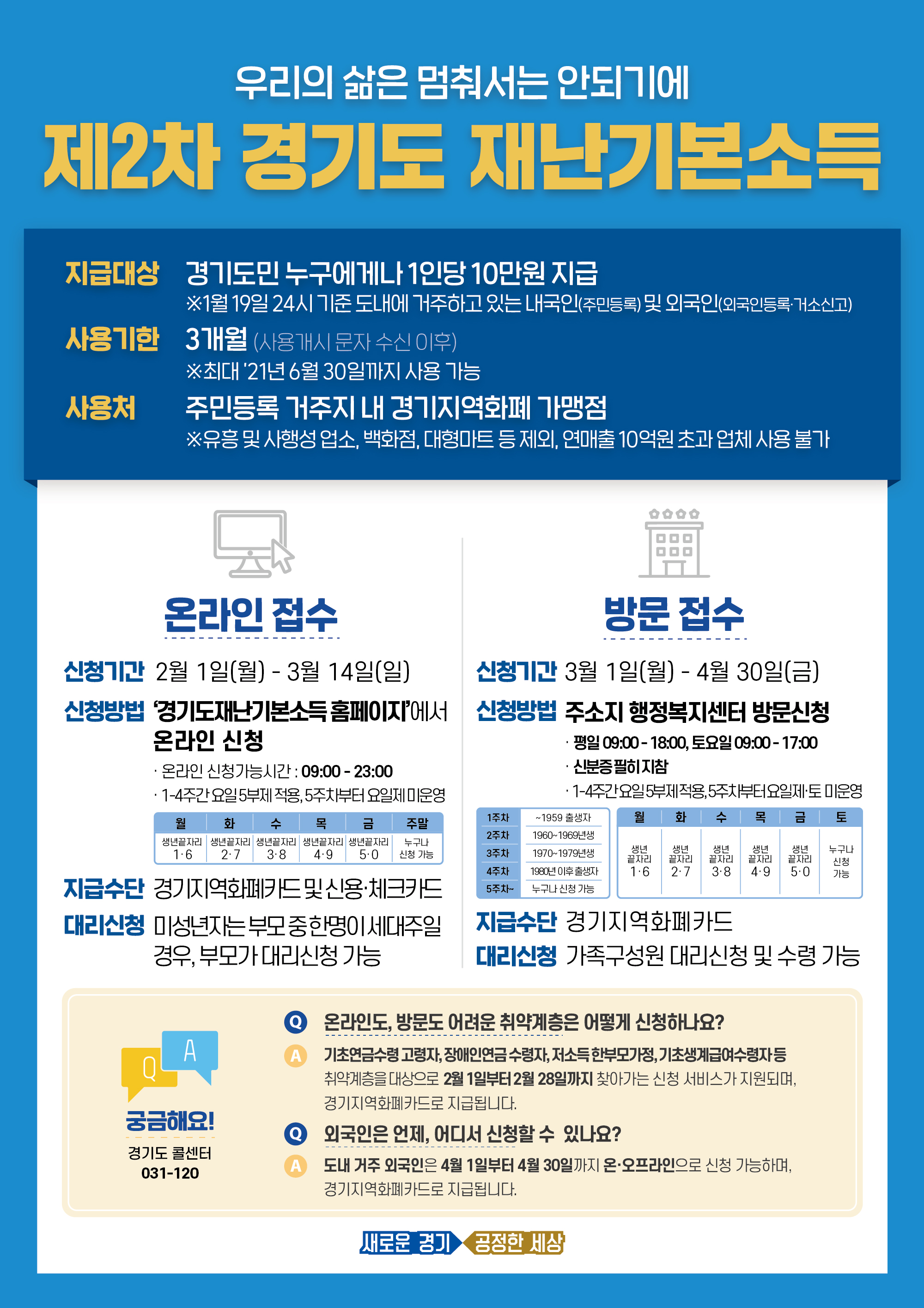 안녕하세요. 이번에 경기도에서 전 경기도민에게 2차 재난 지원금을 지원해주기로 하였습니다. 지급은 온라인 및 방문으로 접수가 가능하다고 합니다.