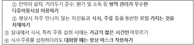 다중이용시설 운영자와 이용자의 자율과 책임에 기반한 방역 관리를 강화하고, 협회, 단체 주도의 자율적인 방역수칙 준수 점검과 감시체계를 운영하고, 방역수칙을 위반한 업소에 대해서는 과태료 처분과 별도로 지자체가 2주간 집합 금지를 실시하기로 하였습니다.