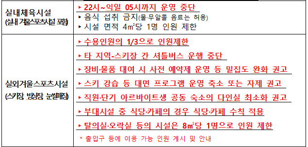 스키장은 스키장 내 식당 및 카페에 대한 집합 금지는 해제되었지만, 오전 5시부터 21시 가지만 매장 내 취식이 가능하다고 합니다. 또한 스키장의 탈의실과 오락실 등도 이용이 가능합니다.
