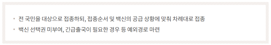 코로나 백신 접종 순서는 전 국민을 대상으로 접종하고, 접종 순서 및 백신의 공급 상황에 맞춰 차례대로 접종한다고 합니다. 백신 선태권 미부여, 긴급 출국이 필요한 경우 등 예외경로도 마련할 계획이라고 합니다.