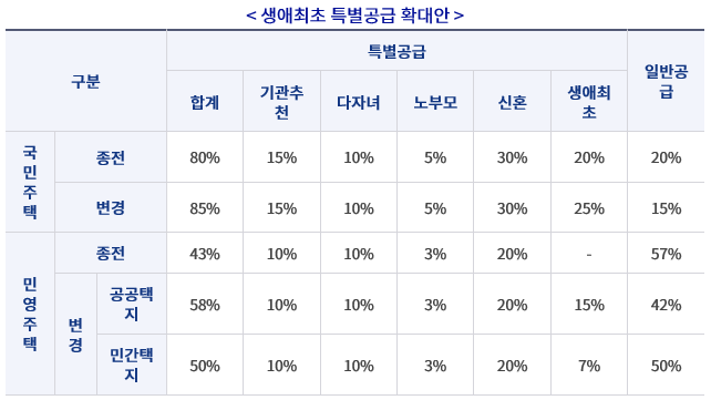 생애최초 특별공급을 확대한다고 하죠! 현행은 국민주택의 20%를 생애 최초로 주택을 마련하는 경우에 한해서 특별 공급 추첨을 실시하고 있습니다. 전용면적이 85㎡이하 공공분양의 세대원 전원 무주택이어야 하죠..