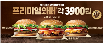 프리미엄 와퍼 각 3900원 행사를 하고 있습니다. 행사 제품은 할라피뇨 와퍼, 통새우 와퍼, 콰트로 치즈 와퍼입니다. 보다 저렴하게 먹을 수 있는 기회입니다.