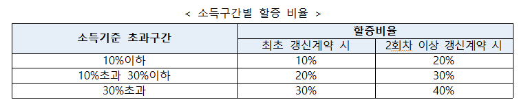 재계약시점에 적요되는 자산기준을 충족하지 못할 경우 1회에 한해 재계약은 가능 하난 임대료 및 임대보증금이 80% 할증됩니다. 아래 표 참조 바랍니다.