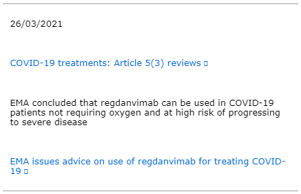 유럽 의약품청인 EMA는 2021년 3월 26일, 셀트리온 렉키로나주 - 레그단비맙을 산소가 필요 없고 중증 질환으로 진행될 위험이 높은 COVID-19 환자에게 사용할 수 있다고 결론을 내렸습니다.