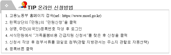 신청은 온라인 고용노동부(www.moel.go.kr) 민원마당에서 신청이 가능하며, 우편으로 신청이 가능하다고 합니다. 코로나 19 상황 종료일 이후 60일 이내 가족 돌봄 휴가를 사용한 본인이 신청할 수 있습니다.