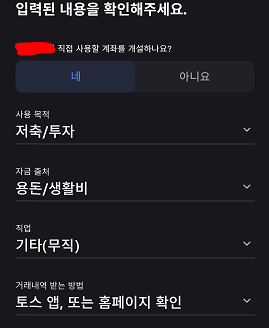 다음으로 계좌의 사용 목적과 자금 출처, 직업, 거래내역 받는 방법 등을 선택하시고 확인 버튼을 눌러 다음으로 넘어가시면 됩니다. 이제 다 왔습니다.
