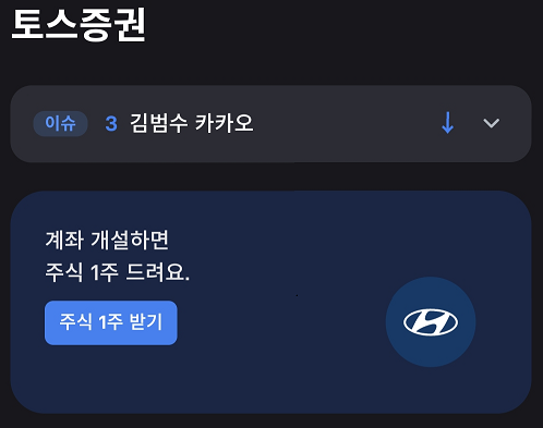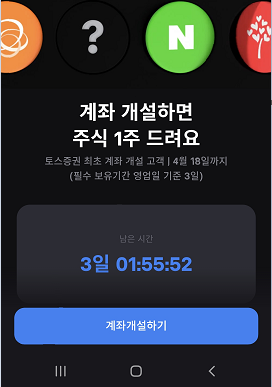 안녕하세요. 토승 증권 계좌 개설 시에 랜덤으로 주식 1주를 받을 수 있는 기회가 생겼습니다. 랜덤으로 받을 수 있기 때문에 토스 앱을 눌러 바로 주식 버튼을 눌러 주식 1주 받기를 클릭해보시기 바랍니다. 삼성전자 등 약간 탐이 나는 주식도 있습니다.