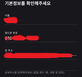 동의를 하고 난 후에 기본정보를 확인하는 페이지가 나옵니다. 토스에 이미 가입되어 있기 때문에 기존 정보를 불러오게 됩니다. 이름, 핸드폰 번호, 집 주소 모두 맞나요?