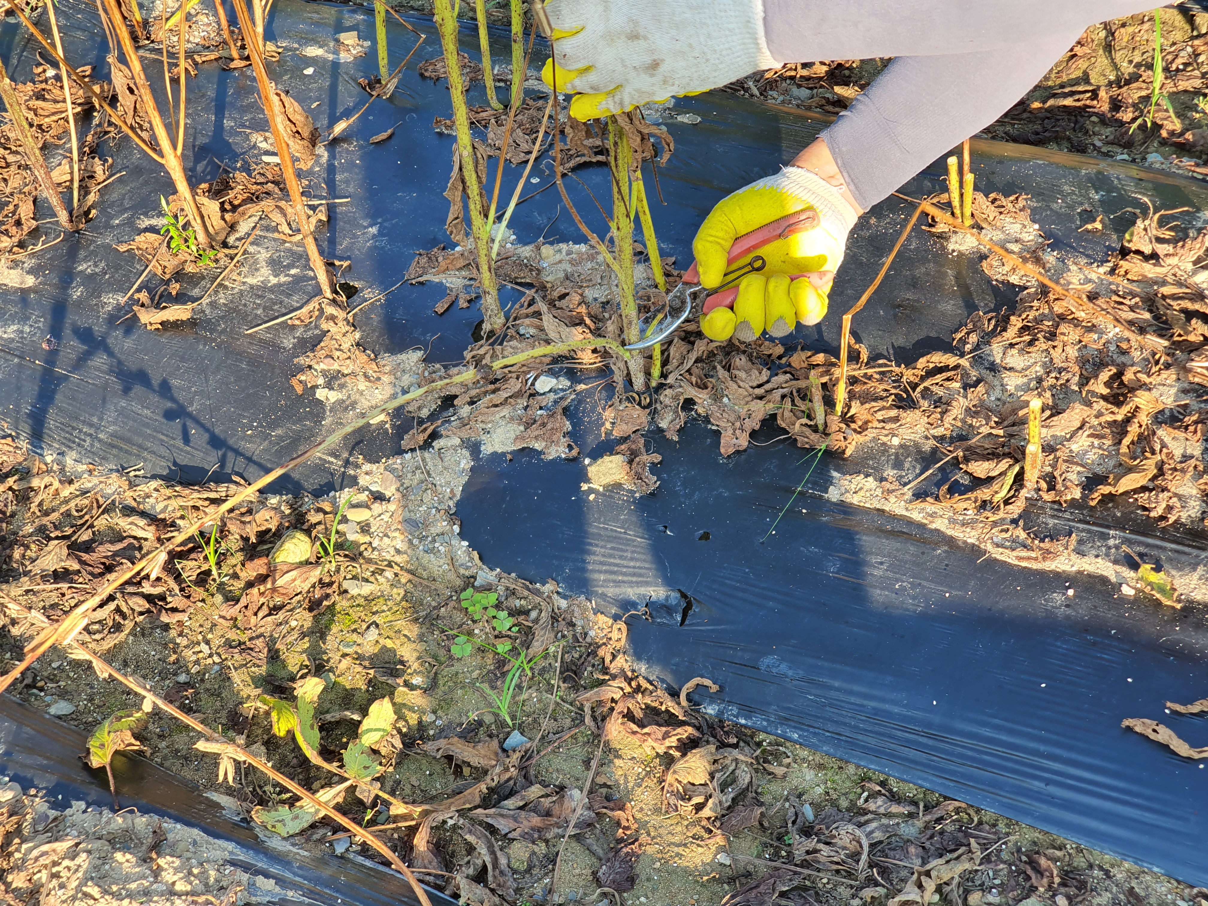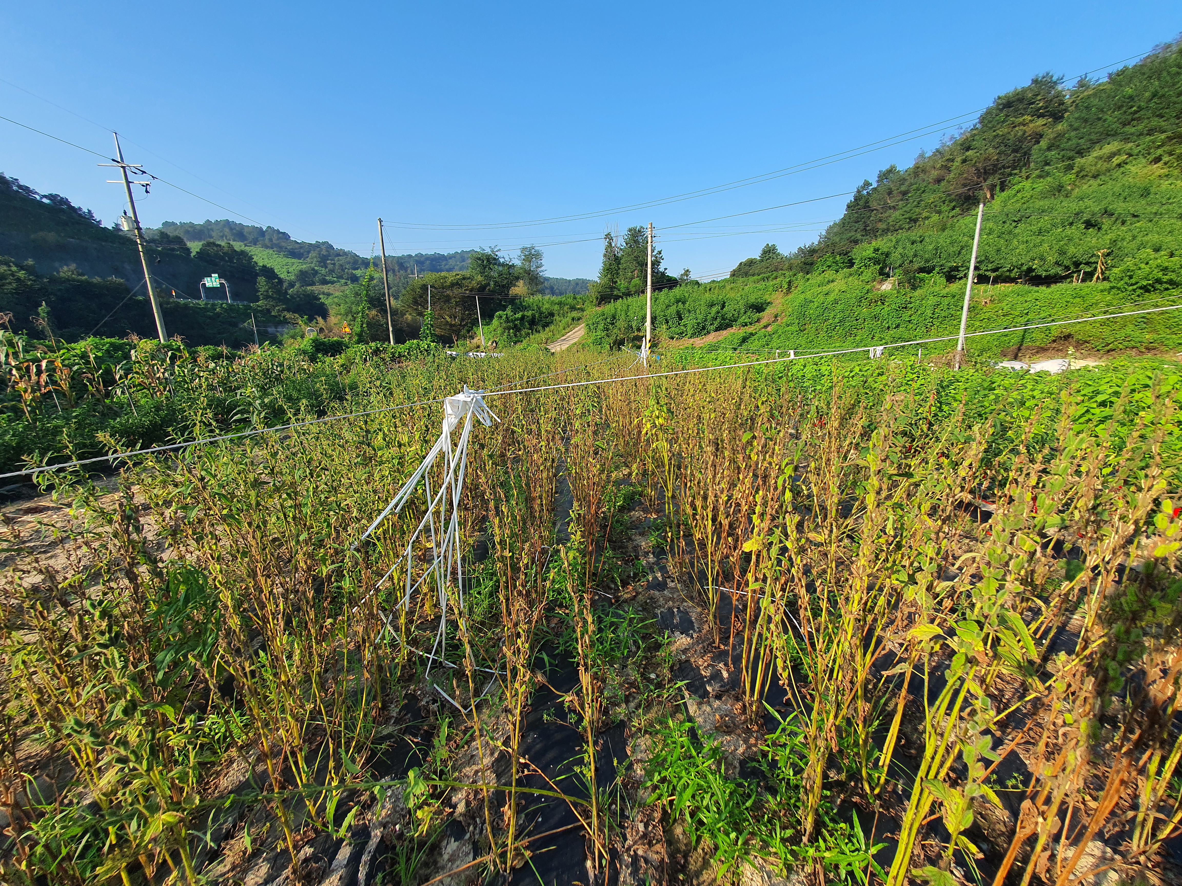 마지막으로는 비를 피하기 위한 방법으로 아래와 같이 비닐을 씌워 말립니다. 참깨가 마르면서 깨가 떨어져서 아래에 첨을 깔고 가운데 기둥을 세우고 기대어 놓습니다.