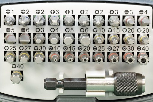 먼저 공구의 주둥이 격인 척에 비트를 삽입합니다. 비트는 별 모양의 비트, 십자, 일자, 6각 등 많은 비트들이 있습니다. 아래 그림 참고하세요.