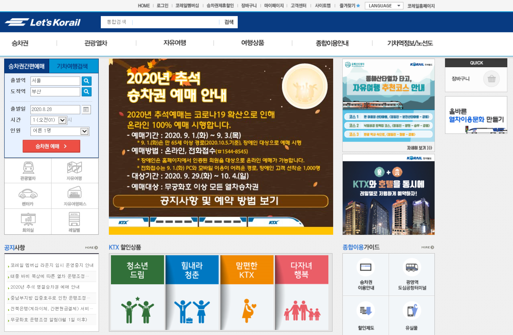 -2020 기차표 예매 일정 : 9월 1일부터 9월 3일까지