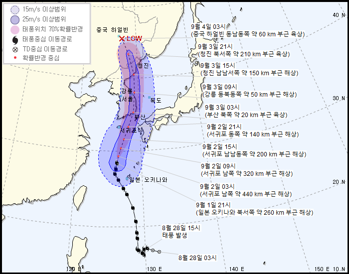 이번 태풍 마이삭은 우리나라에 영향을 미치는 시간은 9/2일 21시부터 ~ 9/3일 21시까지 가장 큰 피해를 줄 것으로 보입니다. 일본 쪽으로 꺾이기를 빌고 싶지만 이미 경로는 한반도를 따라 북상하여 하얼빈에서 소멸할 것으로 기상 예보를 하고 있습니다.