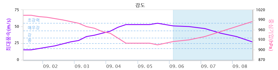 기상청은 6일 9시 현재 제주도 남쪽 먼바다 태풍주의보를 내린 상태입니다. 6일 3시 기준 중심 기압은 925hPa로 점점 기압이 높아지고 있으며, 최대풍속은 초속 51m/s이며, 시속 184km/h로 북진으로 진행하고 있습니다. 최대 강풍 반경은 440km이며, 폭풍 반경은 170km로 매우 강하게 불고 있습니다. 이동 속도는 22km/h입니다.