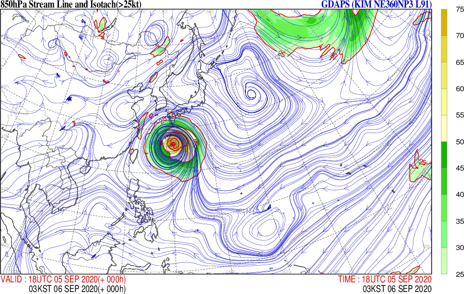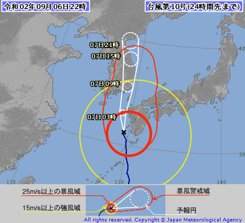 중심 기압은 925hPa로 중심 부근의 최대 풍속은 50m/s, 최대 순강 풍속은 70m/s로 발표하였습니다. 9월 6일 7시 기상청 예보에 따르면, 대형으로 매우 강한 태풍인 10호 태풍 하이선은 세력이 다소 약화되어고, 가고시마현에서는 특별 경보를 발표할 가능성이 작아졌지만, 7일까지 북상하며 매우 강한 세력으로 규슈 남부 아마미 지방에 상당히 접근하였으며, 계속해서 호우, 폭풍, 해일에 대한 최대의 경계가 필요하다고 발표하였습니다.