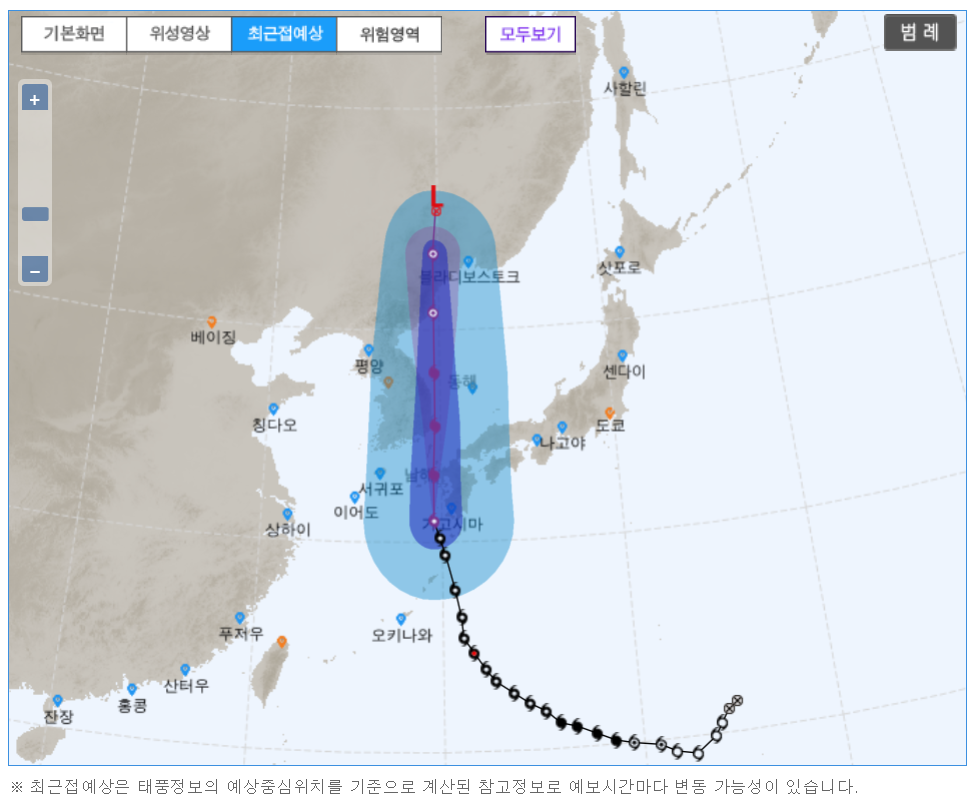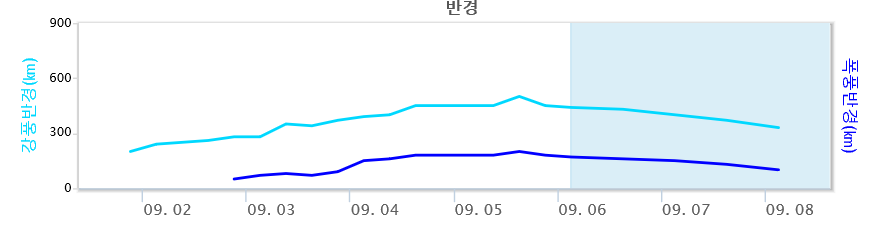 기상청은 6일 9시 현재 제주도 남쪽 먼바다 태풍주의보를 내린 상태입니다. 6일 3시 기준 중심 기압은 925hPa로 점점 기압이 높아지고 있으며, 최대풍속은 초속 51m/s이며, 시속 184km/h로 북진으로 진행하고 있습니다. 최대 강풍 반경은 440km이며, 폭풍 반경은 170km로 매우 강하게 불고 있습니다. 이동 속도는 22km/h입니다.